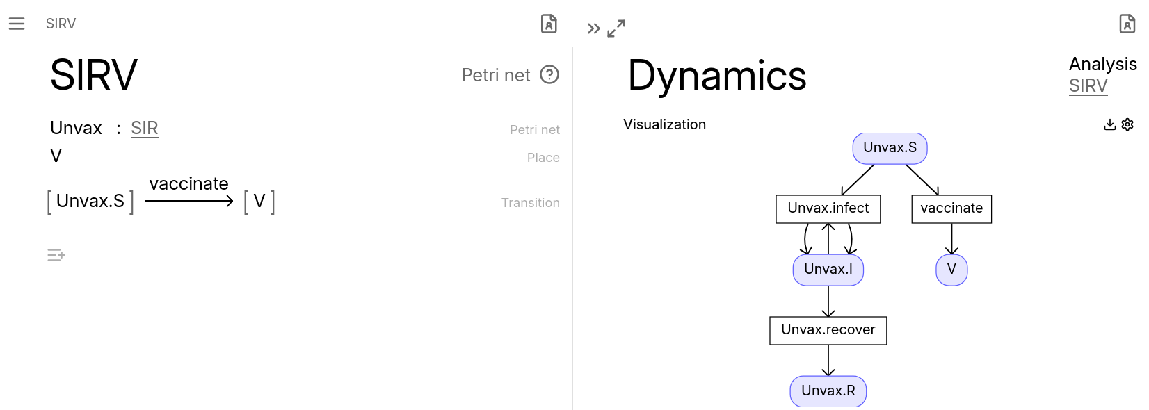 Two major features in the previous release were Petri nets and composing models of discrete theories. This release brings these two together! We have extended CatColab’s DoubleTT implementation to enable composing models of modal theories, which means in particular that Petri nets can now be composed along places. As a tiny example, we can start by instantiating the standard SIR model \mathtt{unvax} = \left\{ S \longrightarrow \boxed{\mathrm{infect}} \mathrel{\substack{ \textstyle\longleftarrow\\ \textstyle\longrightarrow\\ \textstyle\longrightarrow }} I \longrightarrow \boxed{\mathrm{recover}} \longrightarrow R \right\} and then add a new state and transition \mathtt{unvax}.S \longrightarrow \boxed{\mathrm{vaccinate}} \longrightarrow V to obtain an SIRV model.