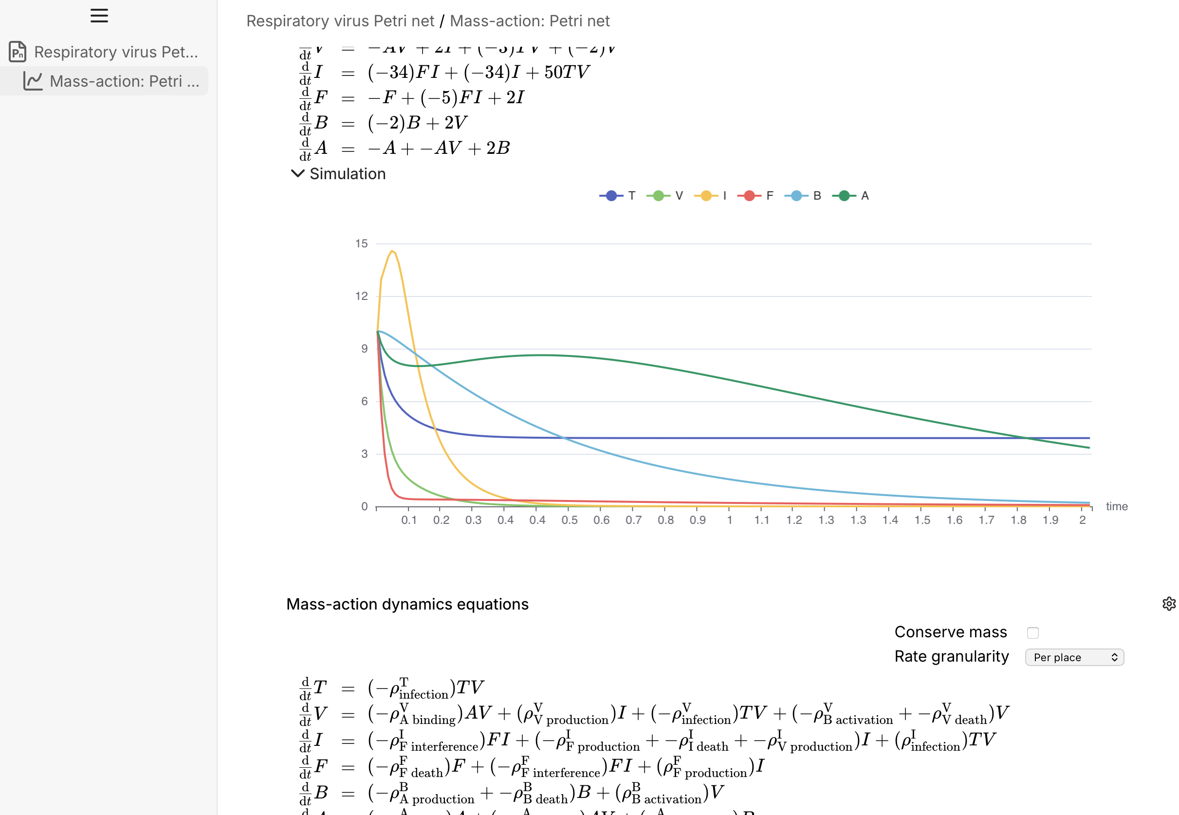 The mass-action dynamics analysis also has two new settings increasing its generality: mass conservation and rate granularity. This reflects a new (non-standard) capability for mass-action dynamics that do not preserve mass. You can read more about unbalanced mass-action in this blog post and its upcoming sequel.