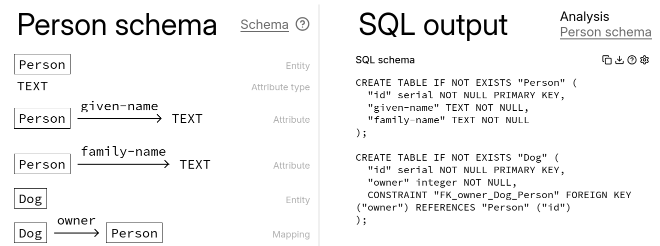 The mathematical history of CatColab can be traced in part to the categorical approach to database theory, as explained by David Spivak and Brendan Fong in Chapter 3 of Seven Sketches in Compositionality. Much of our recent focus has been on quantitative scientific modeling, but we do intend to keep expanding the database capabilities of CatColab. Thanks to Matt Cuffaro, you can now generate SQL schema definitions in several dialects from a schema model in a CatColab. You can read more about this feature in the schema help pages.